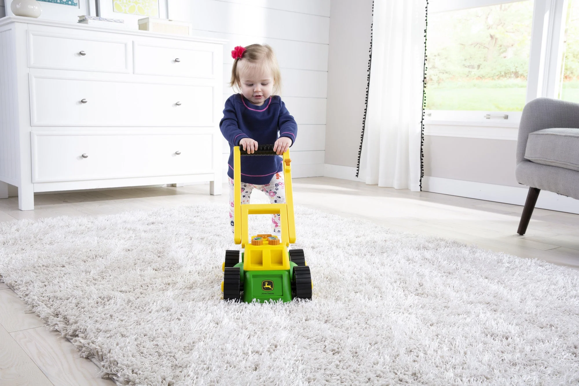 The John Deere Real Sounds Lawn Mower is a fun toy that lets your child get in on the action and help out around the yard. This interactive toy mower features a voice that prompts your child to check the oil and fuel!
