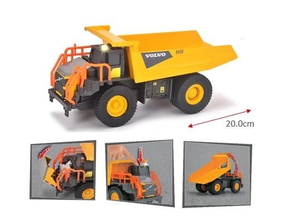 Majorette – Volvo Rigid Hauler – Dump truck (yellow/orange) with rubber tyres, light and sound effects, construction vehicles, premium toy.